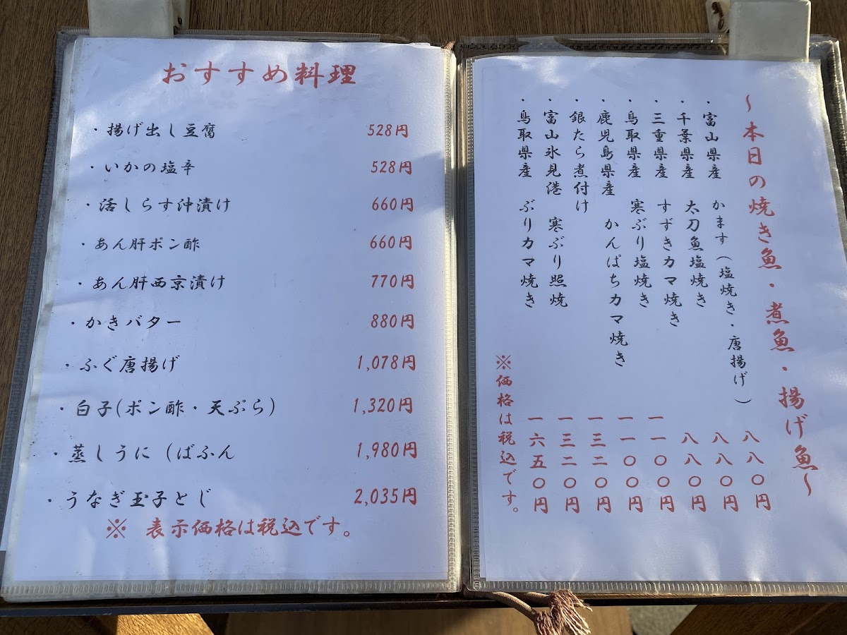 For those who enjoy unique textures and flavors, the 鰻魚押壽司 (Eel Pressed Sushi) offers a satisfying combination of flavors. Meanwhile, the creamy and rich あん肝 (Monkfish Liver) is a delicacy that pairs wonderfully with the robust flavors of the restaurant’s other dishes. The crispy and juicy 唐揚げ定食 (Fried Chicken Set) is a hearty choice that balances out the lighter fish dishes, and the イカの一夜干し (Salted Dried Squid) offers a savory snack with a delightful chewiness. For something spicier, the 明太子 (Spicy Cod Roe) is perfect for those who love a kick of heat.